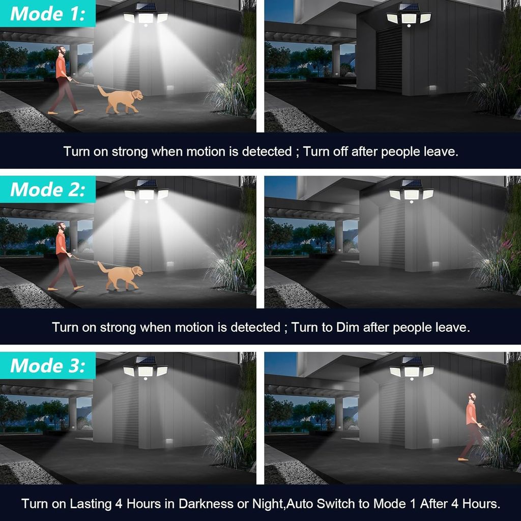 - 【Remote Control & 3 Lighting Modes】:Each solar motion sensor light is equipped with wireless remote control.You can choose the most suitable mode faster and more portable: ①Strong light sensor mode ② Dim light sensor mode ③Strong long light mode. Different lighting way for your daily requirement.