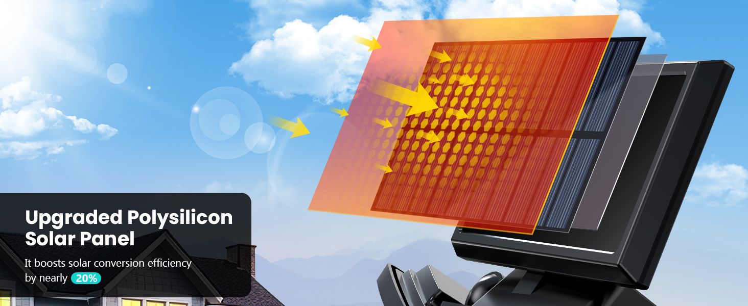- 【Wide Angle Illumination & PIR Motion Inductor】:3 adjustable heads design can horizontally. With innovative wide-angle and intelligent induction control, solar flood light detects up to 270 ° wide lighting angle and 26 feet sensing distance,which can provide extra brightness and more visible area.