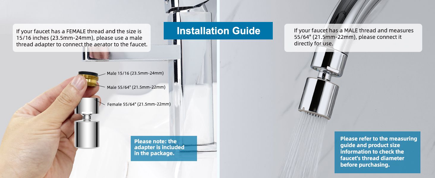 - Easy Installation: Only takes a few minutes, you will complete the installations.Please note that this adapter is only for faucets with removable aerators. If your faucet is a 55/64"(22mm) female faucet, please connect directly.