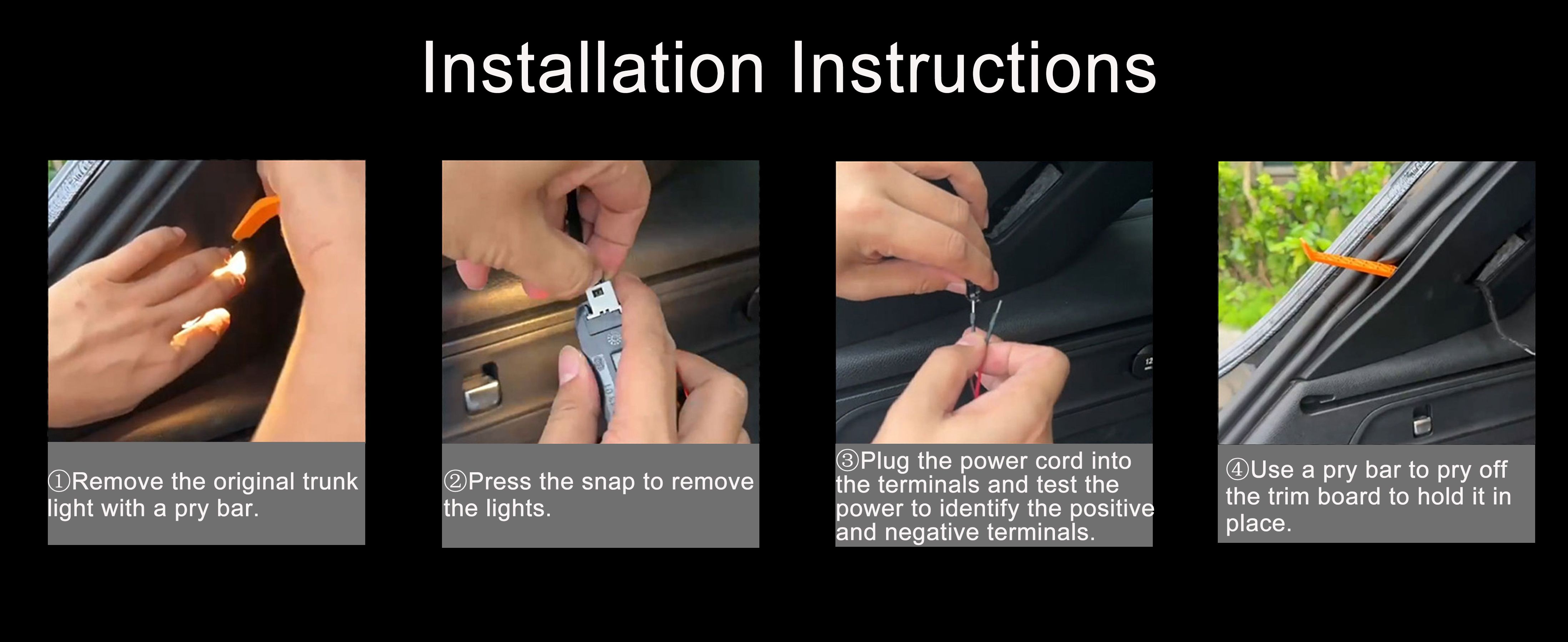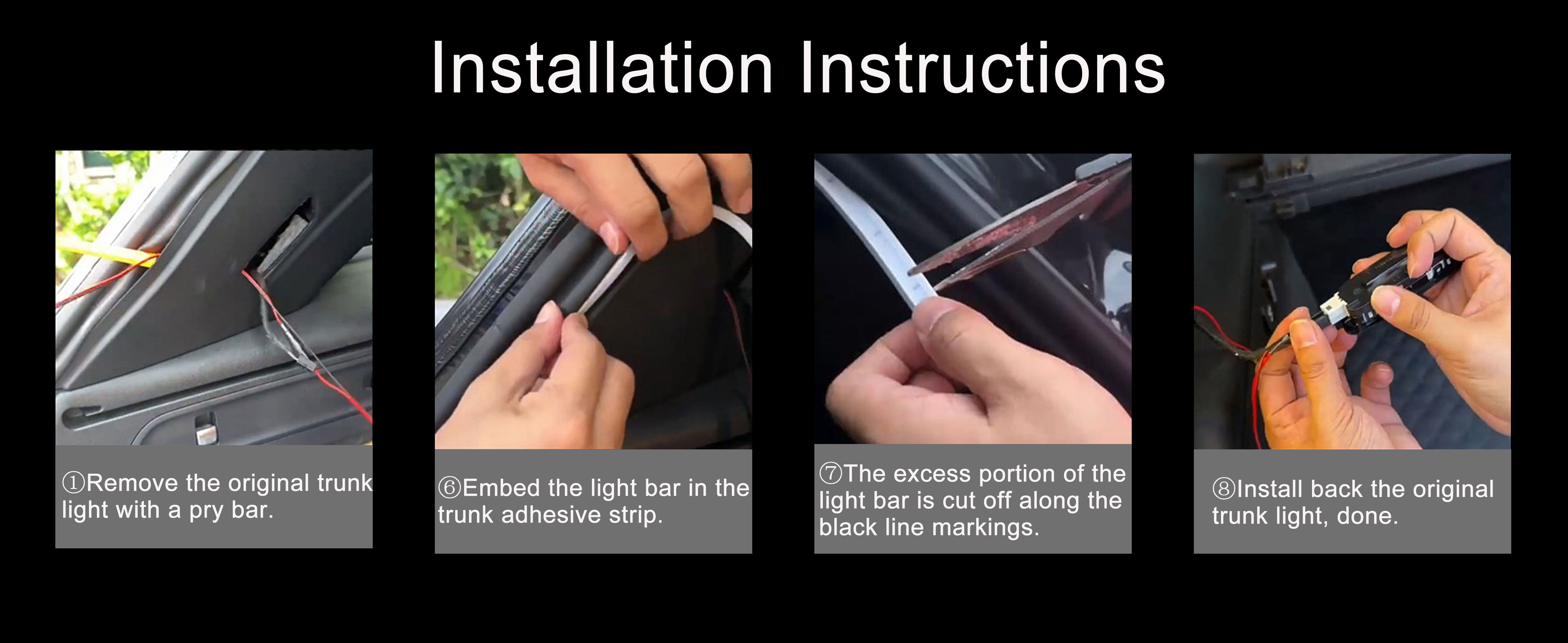 Non-Destructive Installation: The trunk led light strip interior adopts the power connection method of pins, only need to connect the positive and negative wires to the original car lights, and then embed the light strip into the original adhesive strip in the tailgate, no need to break the wire installation.