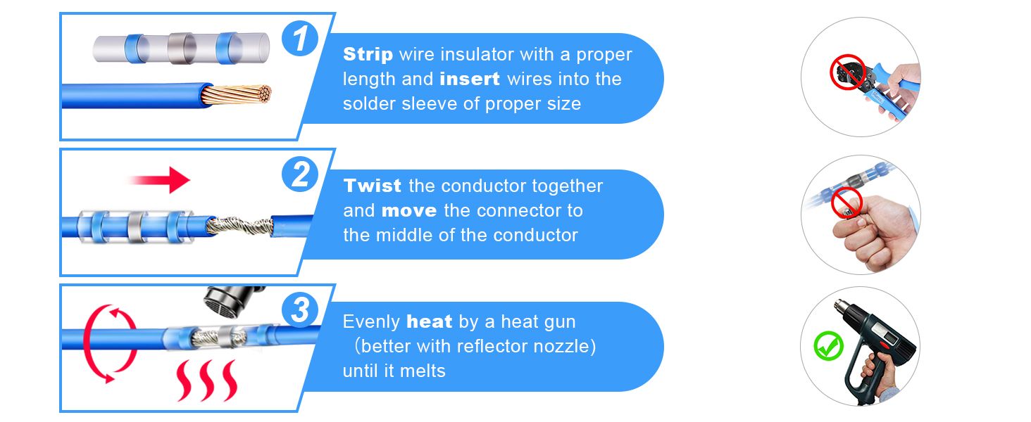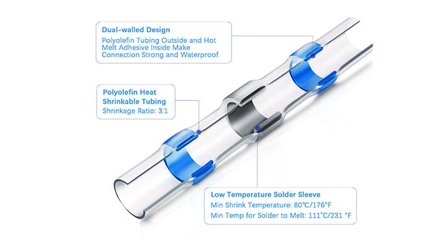 Time and effort saved: No welding or crimping is required; a hot air gun is all that's needed to complete the connection, making it faster and more convenient than traditional methods. Suitable for confined spaces: The connection is flexible and does not require crimping or welding in confined spaces; temperature can be controlled simply with a hot air gun. Waterproof sealing performance: Each mating connector contains two hot-melt waterproof rings, which help improve its waterproof performance. High temperature resistance in a short time: The mating connector uses special materials to prevent the heat shrink tubing from melting before the solder ring.