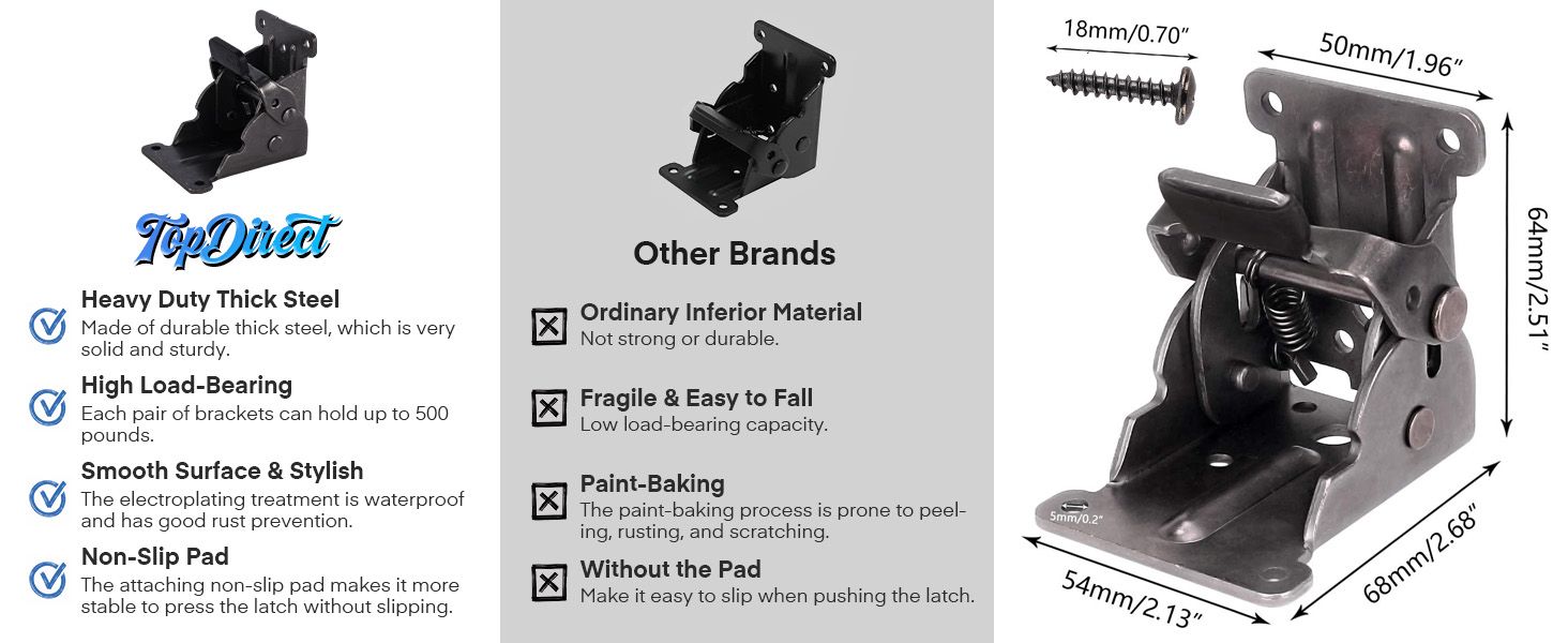 [Materials] The folding bracket is made of sturdy thick steel with a rust-proof surface treatmentto ensure the self-locking hinges are corrosion-resistant.