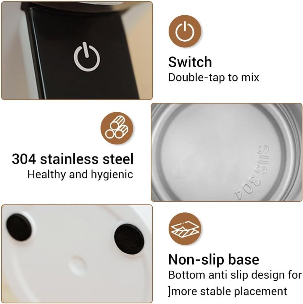 - Double Click To Stir: The stirring function can be activated by a simple double click. The built-in powerful motor provides super power to quickly stir all kinds of beverages such as coffee or milkshake, ensuring that the powder or granules dissolve instantly without residual lumps.