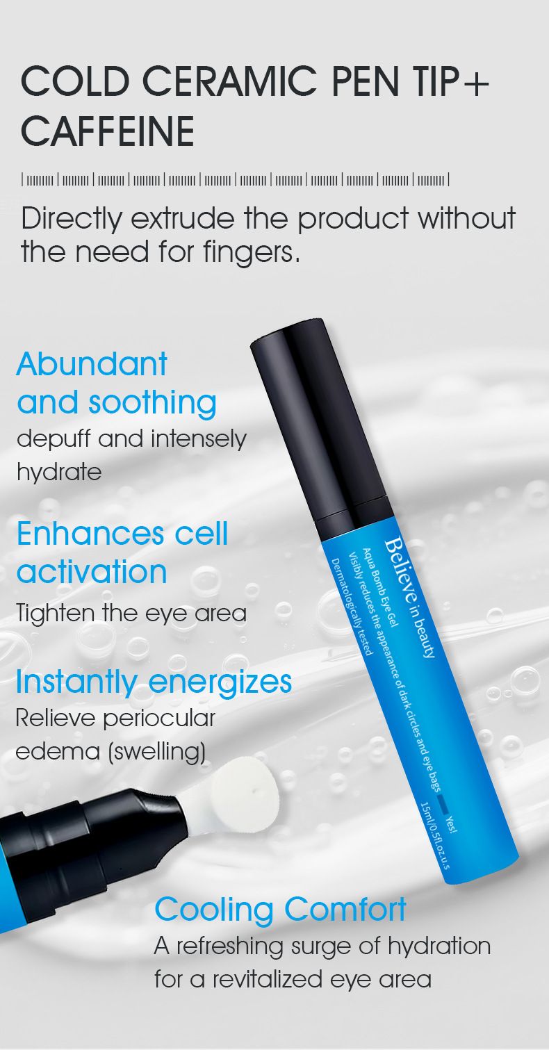 - Caffeine and Hyaluronic Acid: Depuffs and delivers intense hydration.