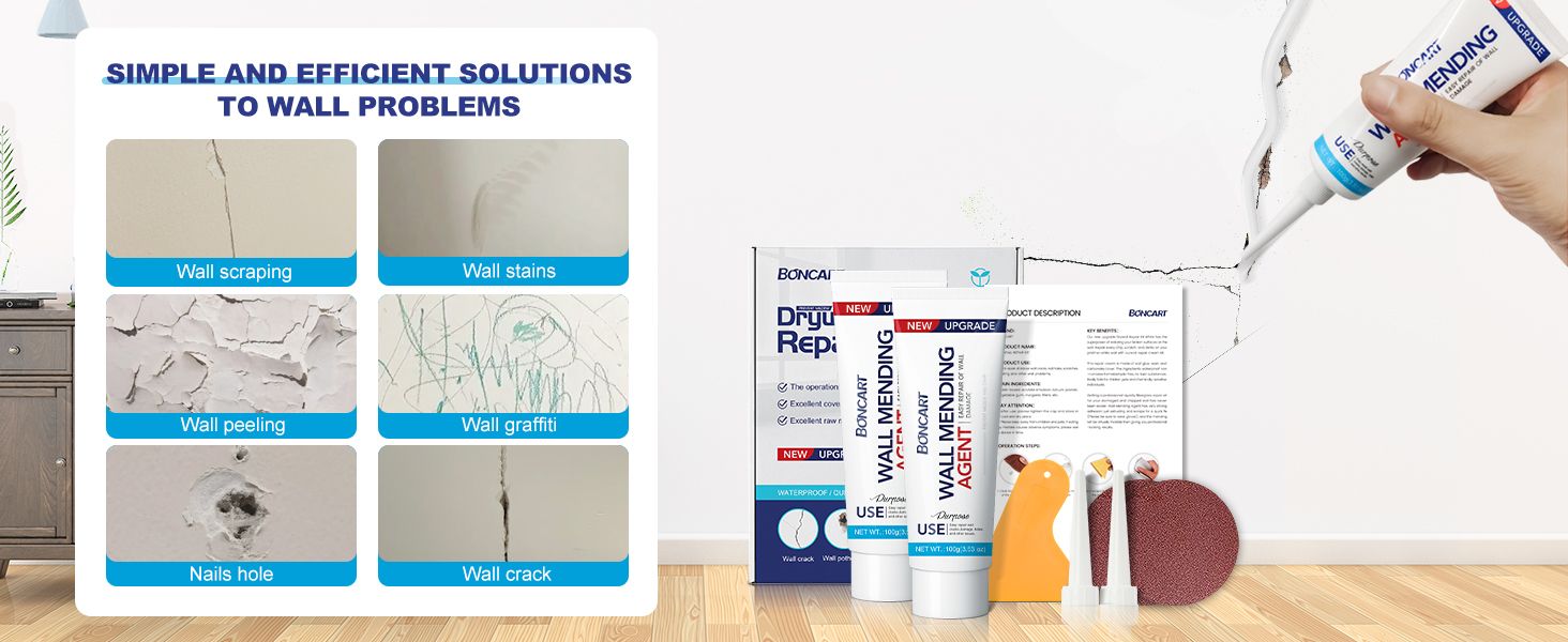 - BONCART wall repair kit can solve all kinds of wall damage.Drywall cracks,wall stains,nail holes,wall peeling,wall stains,wall graffiti.Let your walls a new look.