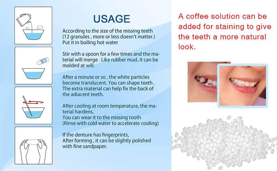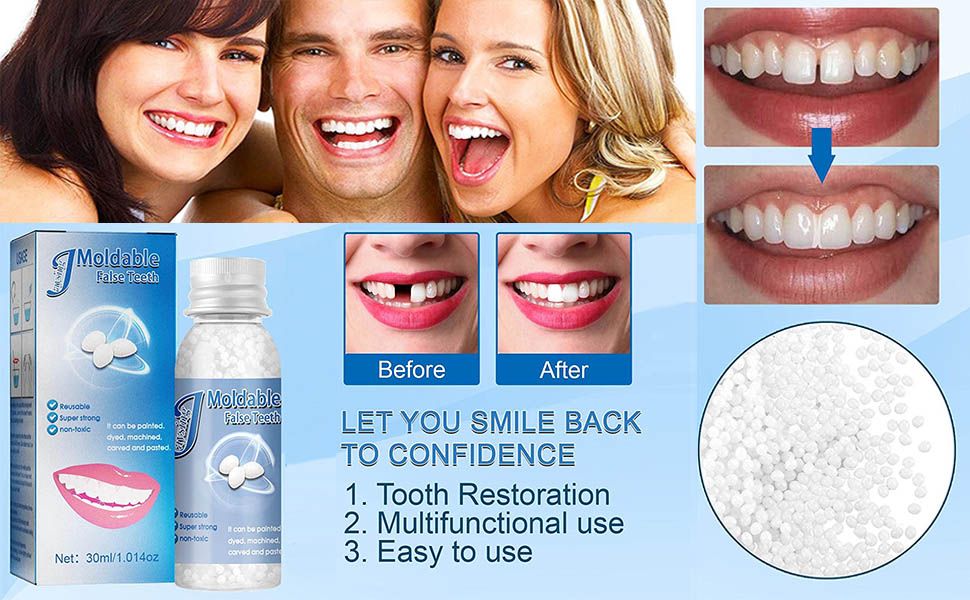 Good for broken teeth,large gaps,uneven teeth and missing teeth.30ml denture repair beads enough to make 15 tooth,meet your daily needs