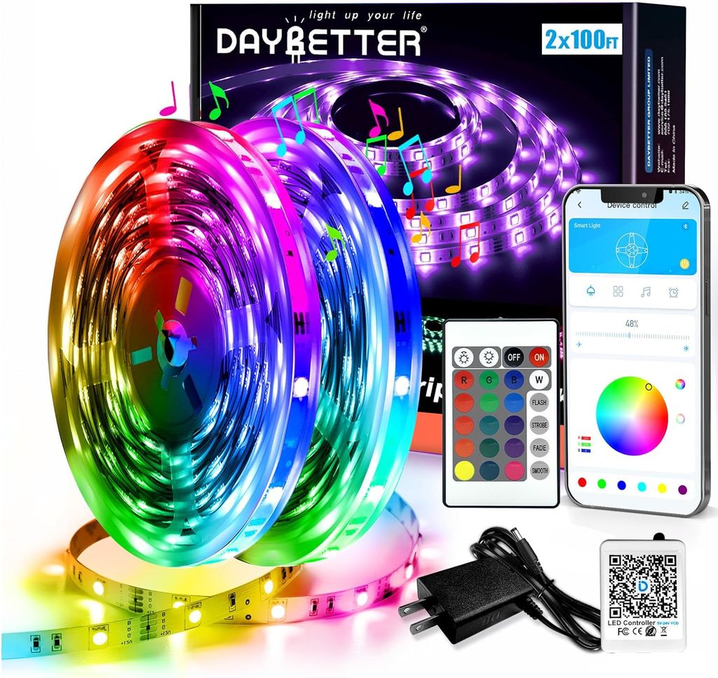 - Smart APP and IR remote control: The 130 feet led strip lights support both app DAYBETTER and 24 keys ir remote for control, Different modes can be chosen, like Flashing, Quick, Jump, Fade, etc. You can freely choose to control 16 million colors