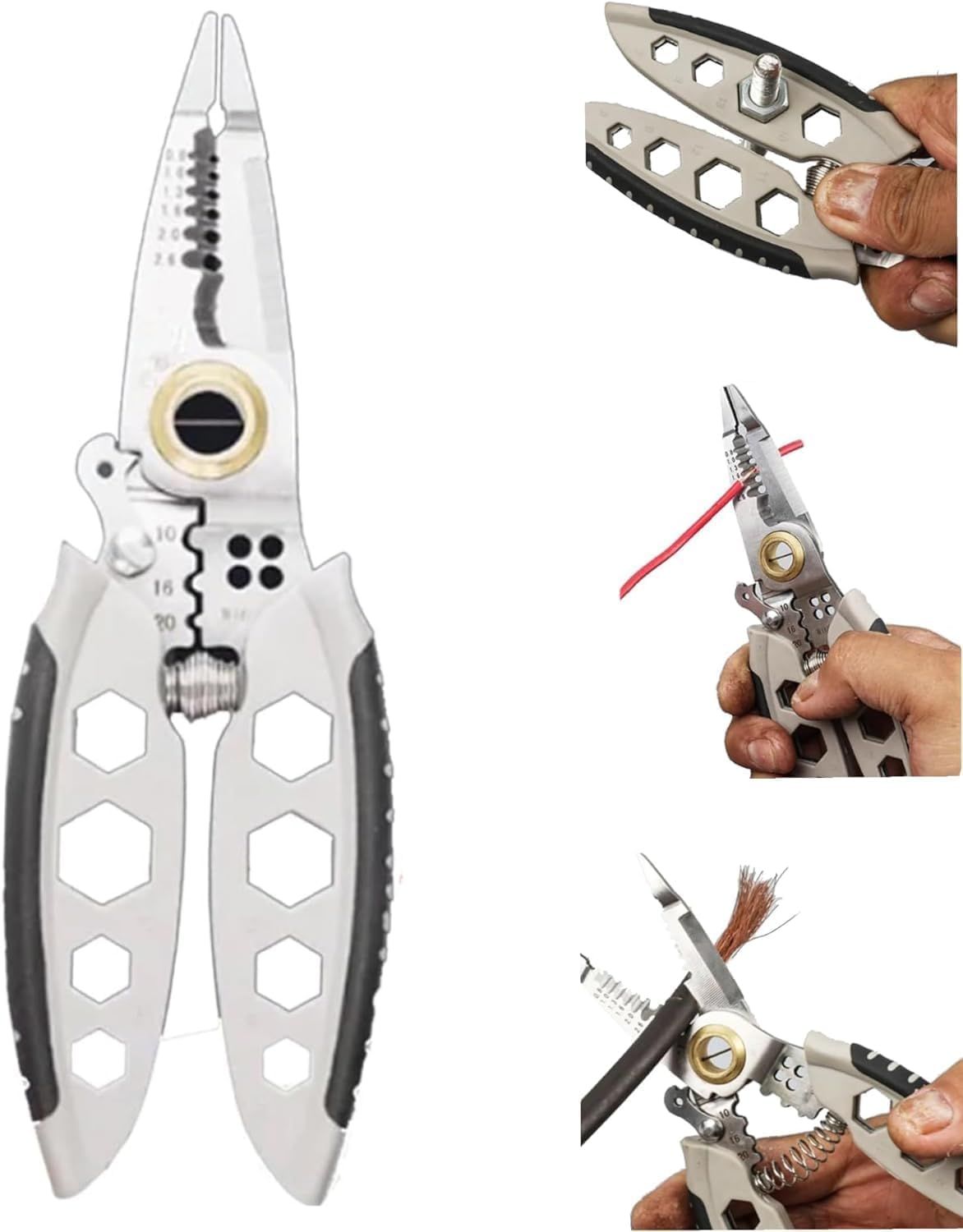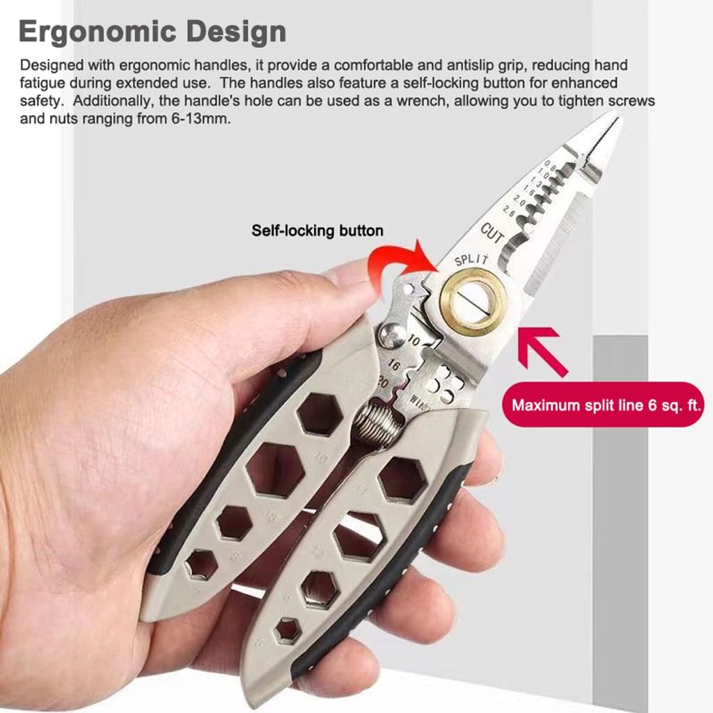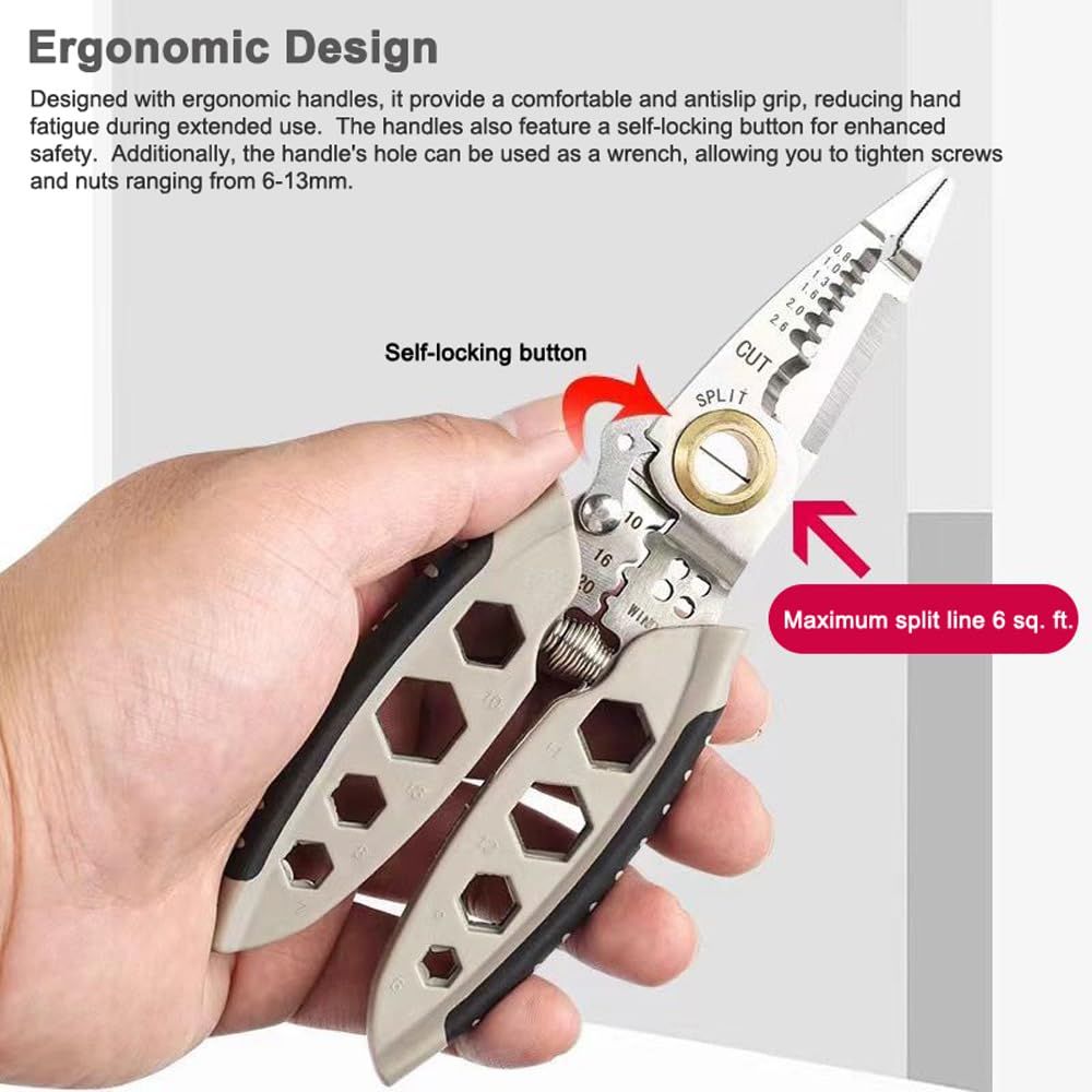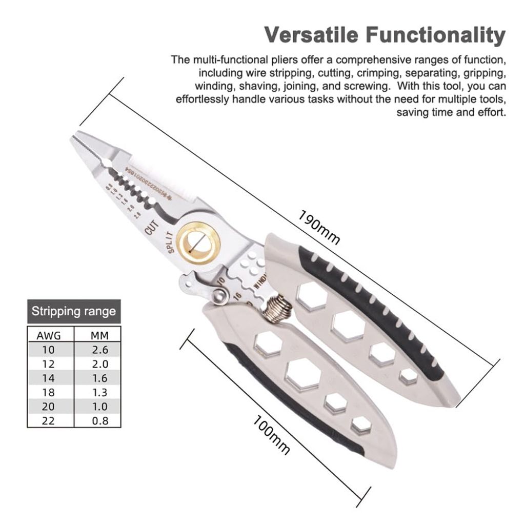 - ✔️ Versatile Functionality: The multi-functional pliers offer a comprehensive ranges of function, including wire stripping, cutting, crimping, separating, gripping, winding, shaving, joining, and screwing. With this tool, you can effortlessly handle various tasks without the need for multiple tools, saving time and effort.